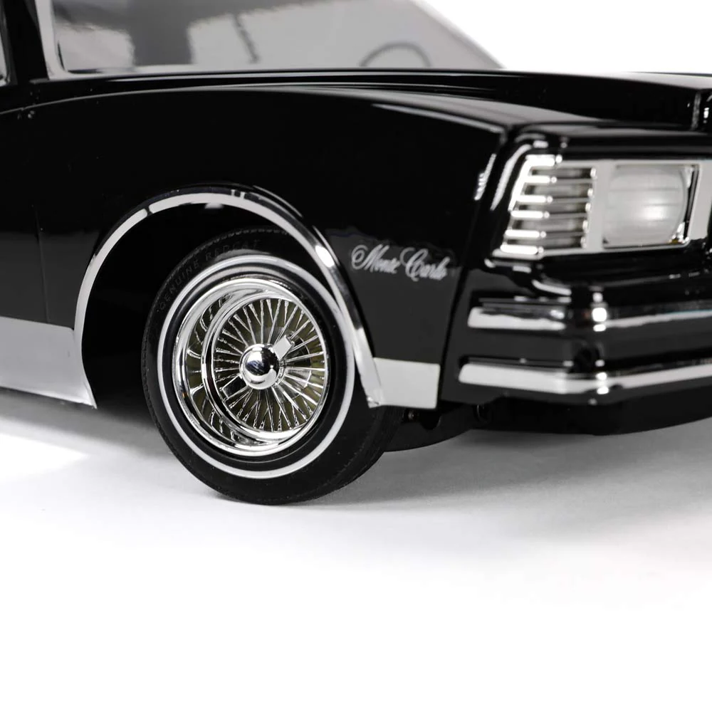 The fully licensed 1979 Chevrolet Monte Carlo body is a highly detailed 3 piece body, with painted side mirrors, clear windows, detailed interior, injection molded chrome plastic details, chrome decals, magnetic body mounts and is LED light ready. The Monte Carlo is available in green or purple. A clear body will also be available for purchase for those of you who want to do your own custom paint job. The Monte Carlo also includes authentic looking whitewall tires mounted on chrome wire spoke wheels with center knockoffs.